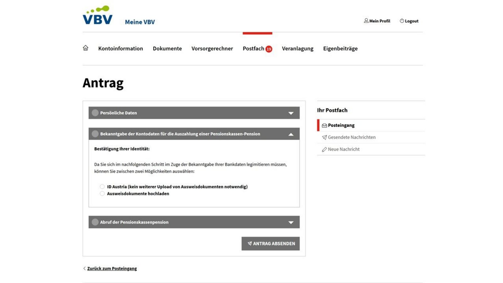 Gute Nachrichten für alle, die unser Onlineservice Meine VBV nutzen: Wenn Sie sich mit ID Austria einloggen, entfällt bei Online-Anträgen der VBV-Pensionskasse im Zuge der Legitimierung Ihrer Bankdaten ab sofort der zusätzliche Upload von Ausweisdokumenten.